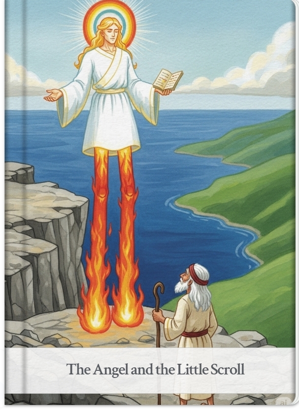 A story for readers aged 10 and above titled "The Angel and the Little Scroll," which faithfully recounts the Apostle John’s encounter with a mighty angel and the command to eat a small, bittersweet scroll as described in Revelation Chapter 10.