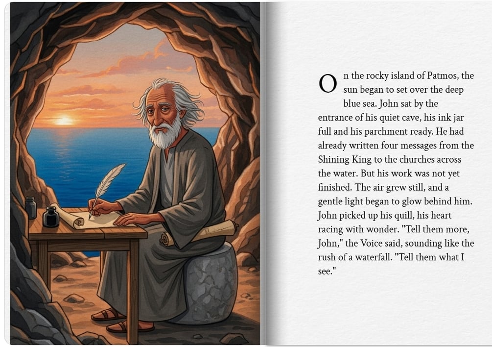 A story for a 7-year-old that concludes John’s messages to the churches in Revelation Chapter 3, focusing on the letters to Sardis, Philadelphia, and Laodicea. It explains Jesus’ call for his followers to be wakeful, faithful, and wholehearted, and includes scripture references to help young readers connect with the Bible.
